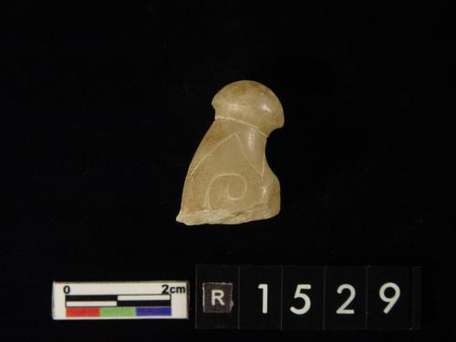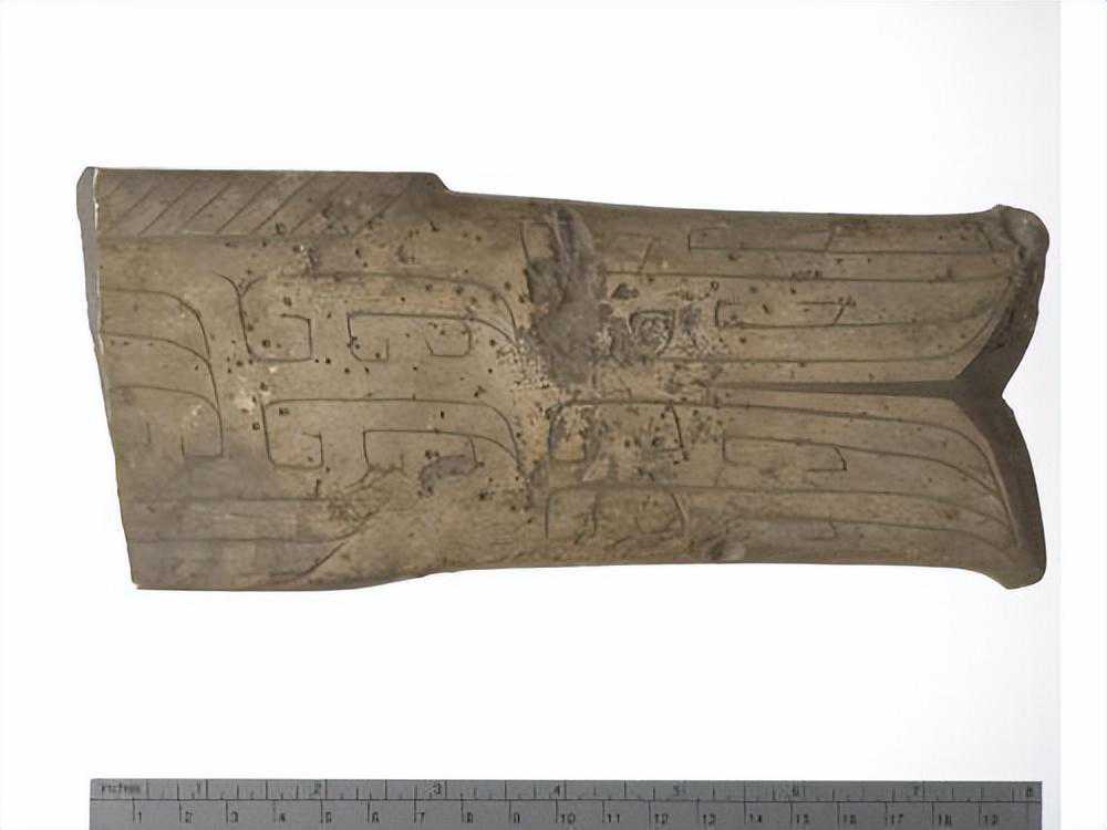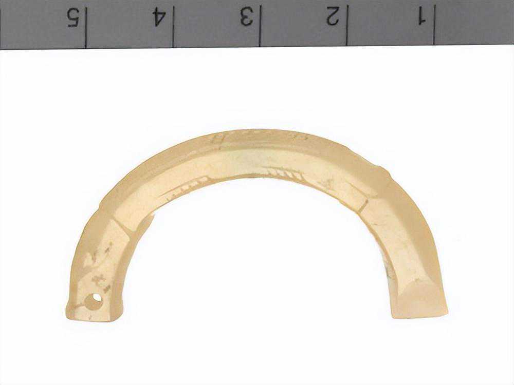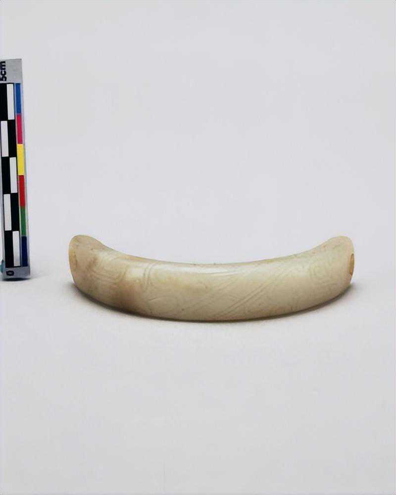 器为弧状,两端有孔,外面刻有带目文之纹饰两组,色白,微有斑。