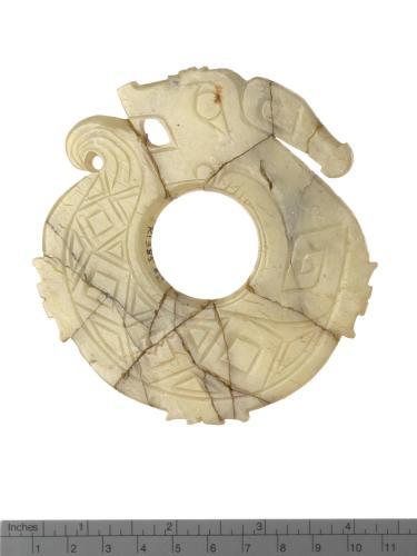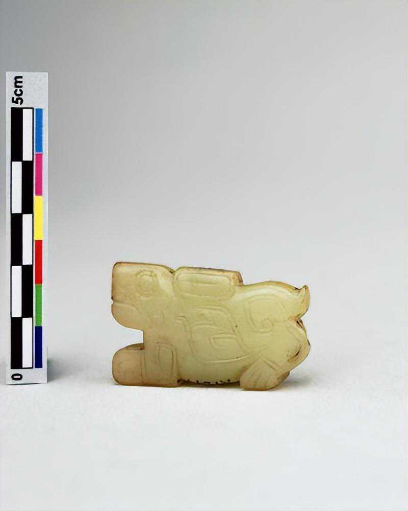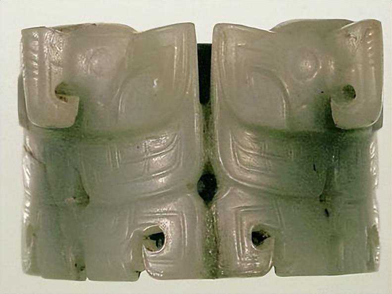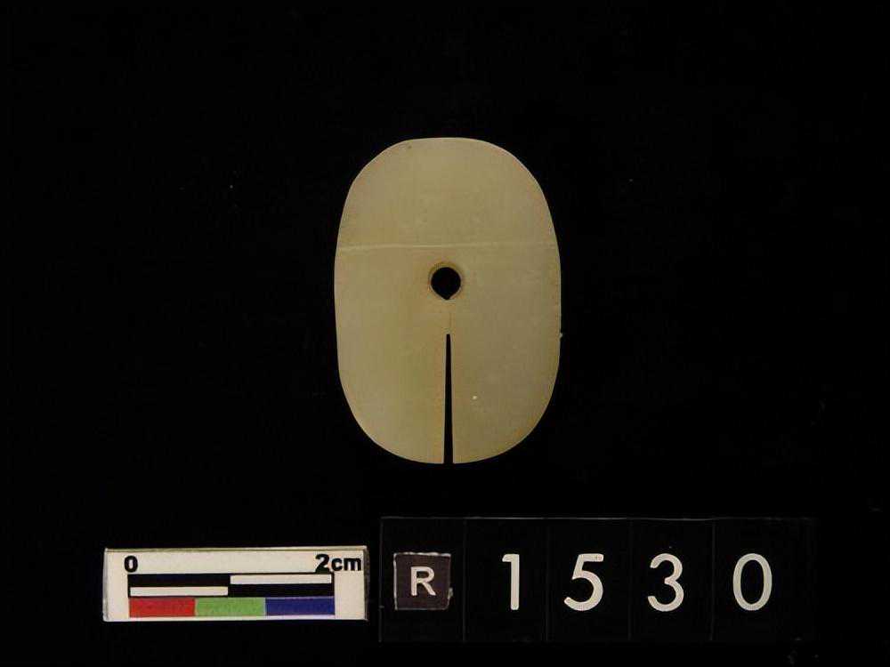 为蟠龙之侧面,口为一长槽,中为一穿,两者相连而实不连,色淡白。