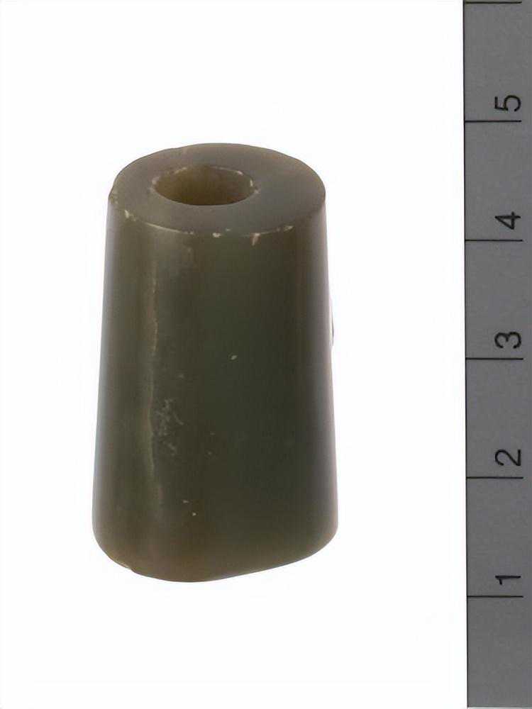 此件玉器出于石磬的上面,深灰绿色,顶端钮形,下接一细腰形茎,有二周弦纹,形体细小,可能是击磬所用木棒的柄部。色暗绿。。。玉质很不错。。。