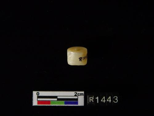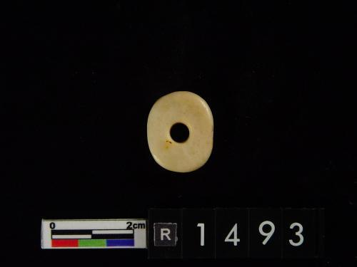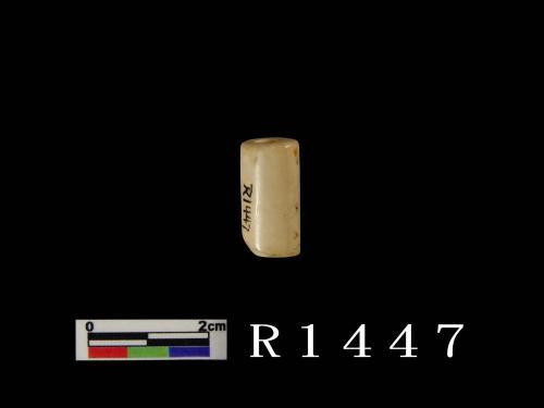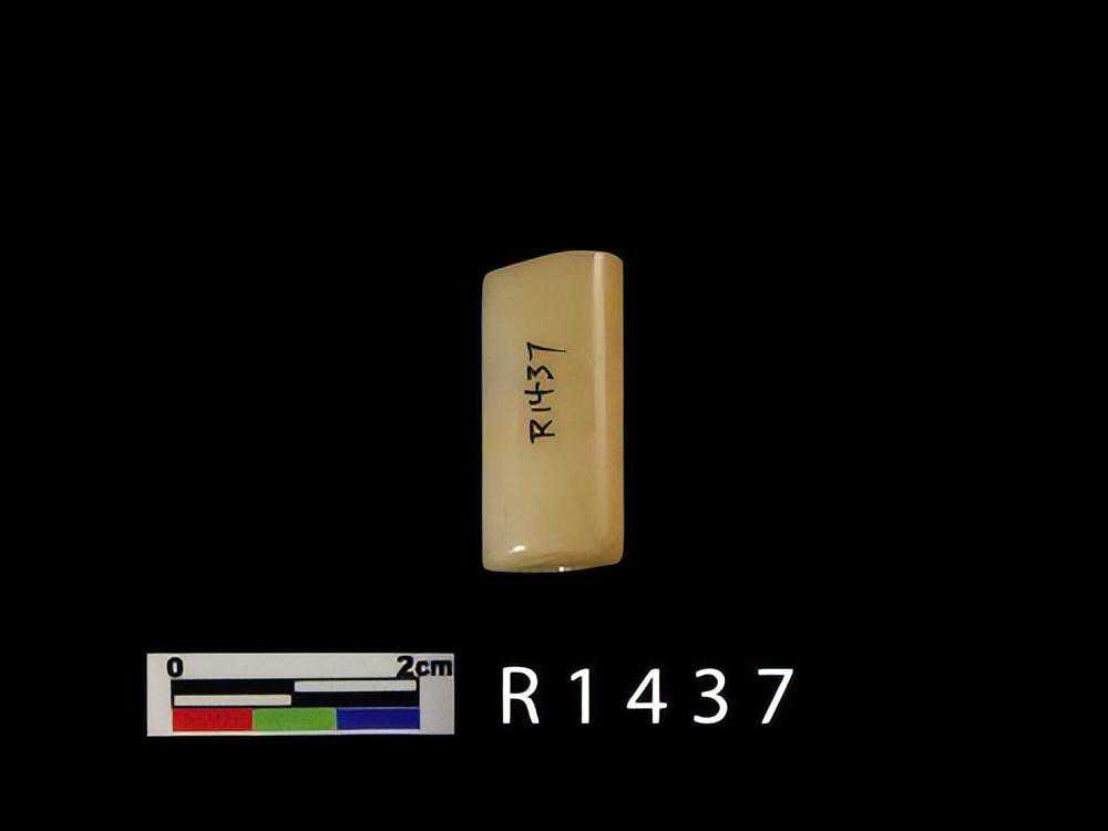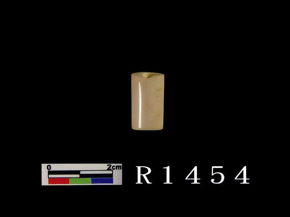 白色残片,表面平齐且光滑,一长边有四齿残存。另一端呈断裂面,残存有一圆形穿孔痕,表面部份呈剥蚀粗糙面。