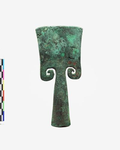 形状如铲子,柄部有一椭圆形銎,銎孔端饰一器面,中间饰蝉,与铲端交接处饰一兽面。