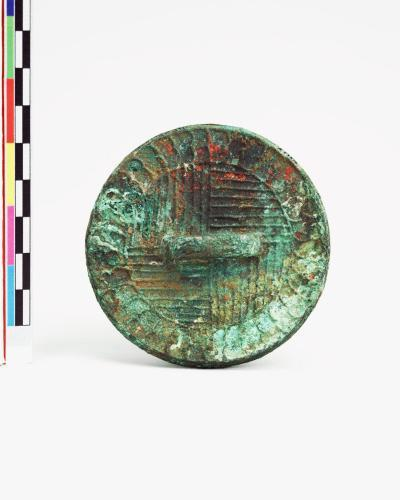 此面铜镜出土于墓室西壁,由于出土时面向上而钮向下,是个圆面,当时的田野绘图及纪录者称为“铜圆片”。梁思永先生(1904─1954)见背面有钮,认为是重大的发现,称为“殷代的铜镜”,但有些学者并不认同。直至1958年高去寻先生(1909-1991年)从这件器物的尺寸大小、厚度、外缘、纹饰、镜面和钮型等六个方面进行