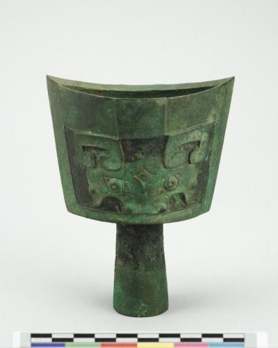 颈饰兽面纹之穿耳二个及大兽面二组,其下为三角雷纹及兽面纹,足兽面纹及雷纹一圈。间有蓝色。有铁痕。圈足有孔二。