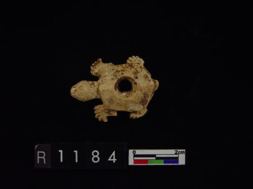 全体作近圆形,头突出,四足屈曲作俯伏,正面及四肢俱凸起,中有一孔,色绿。