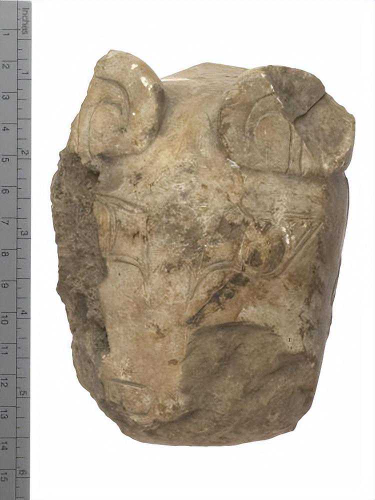 为一平面雕刻,背凹而面略凸,头上两角属曲,两旁有两小耳,双目圆睁鼻大,下为一槽,形极狞恶,色白,有涂硃痕。