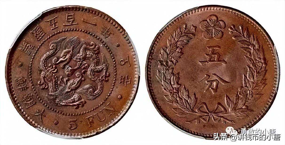 而韩改币的主体币,就是这个时期诞生的朝鲜“五分”铜元,作为开始铸造于朝鲜开国五百一年(公元1894年),即大清光绪十九年的机制铜元,朝鲜“五分”铜元要比清朝开铸“光绪元宝"早6年。大清朝闭关自守的程度可见一斑。朝鲜“五分”铜元,用红铜铸造,钱面正中是珠圈双龙,珠圈与边齿之间是一行呈圆圈状排列的字,此币布局合理,制作精细。流入我国的数量巨大,多见于东北和华北沿海地区。