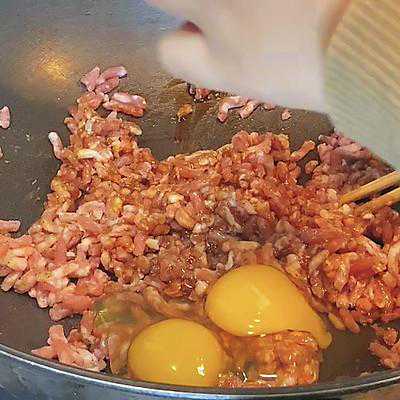 5、加入两个鸡蛋,把馅搅拌均匀(一个方向200下)。