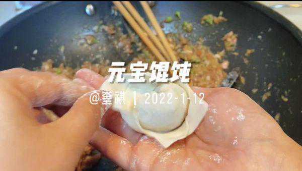 13、用勺子放一勺馅在馄饨皮上,三角形对折,把边压实。再把另外两个角捏在一起就可以了。