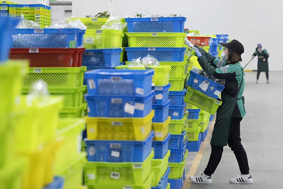 松江,叮咚买菜辰塔路基地。菜品从全国汇聚而来,分拣人员紧张工作中。萧君玮摄