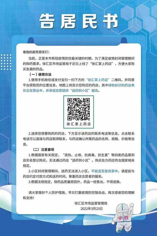 徐汇区上线一款“徐汇掌上药店”,手机扫描下方二维码,即使隔离在家也能够快速方便地查询到附近药房的经营状态和联系方式,通过直接与药房电话联系,让药店能够给予及时、专业的购药服务和用药指导。徐汇区不少药店承诺志愿为封控小区居民提供“送药到小区”服务。