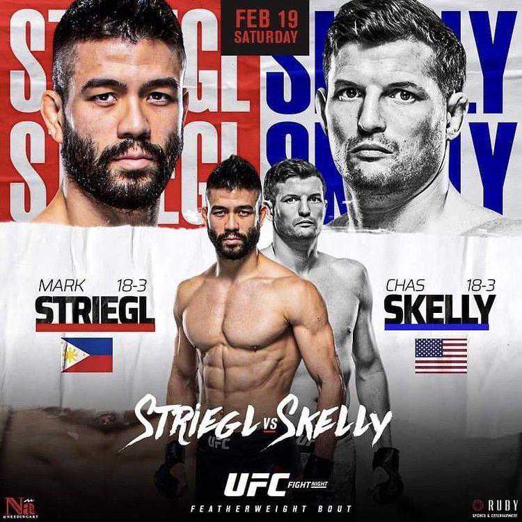 一场羽量级对决:菲律宾选手“无限”马克.施特里格尔(18胜3负)VS.美国“拳击手”查斯.斯凯利(18胜3负),比赛将于明年2月19日的格斗之夜上举行。