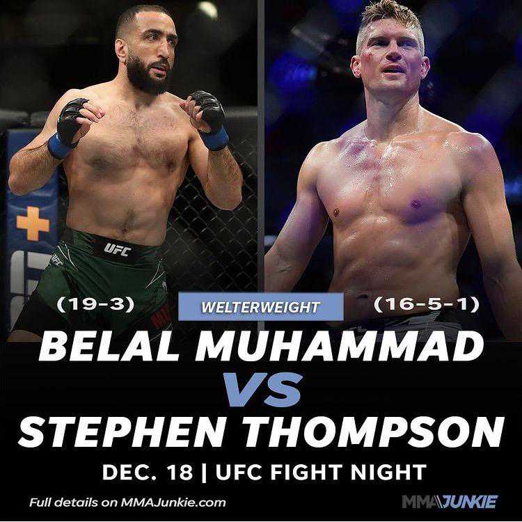 一场次中量级排名选手对决:现量级排名第九的“牢记吾名”贝拉勒.穆罕默德(19胜3负)VS.现量级排名第五的“神奇小子”斯蒂芬.汤普森(16胜5负1平),比赛将于12月18日的UFC拉斯维加斯45上作为联合主赛举行。