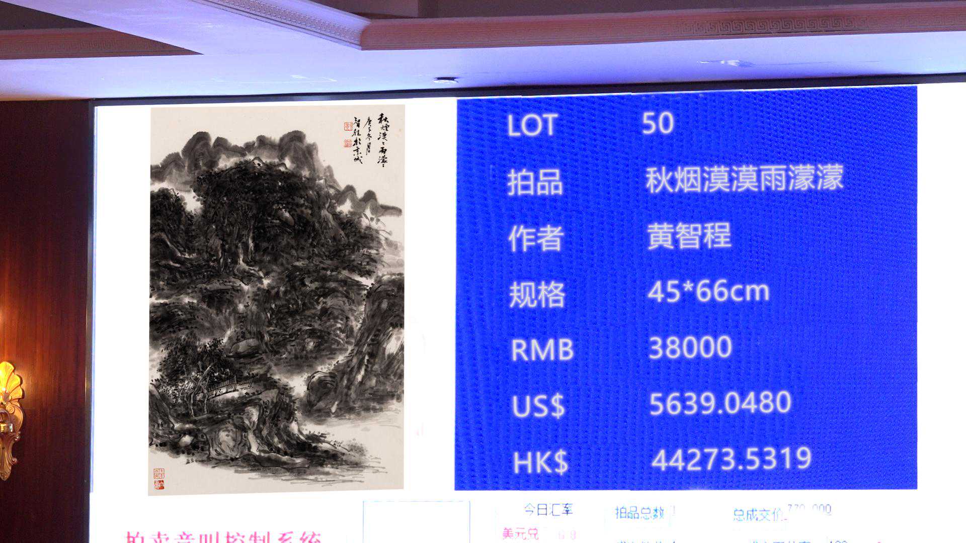 2022中国香港夏季艺术品拍卖会于7月28日下午1点40分在香港城景国际酒店二楼水晶厅举槌。著名画家黄智程的国画作品颇受藏家追捧,6幅参拍作品全部成交。国画山水《秋烟漠漠雨蒙蒙》经过多轮举槌,最终以38000元(RMB)成交;国画山水《湖山幽居》以36000元(RMB)成交;国画花鸟《鱼乐图》以24000元(RMB)成交;国画花鸟《雨后龙孙长》以23000元(RMB)成交;国画花鸟《竹君子石大人》以20000元(RMB)成交;国画花鸟《春意》以18000元(RMB)成交。此次拍卖黄智程的作品价格稳定,略有上涨,成交率100%,表现上佳。