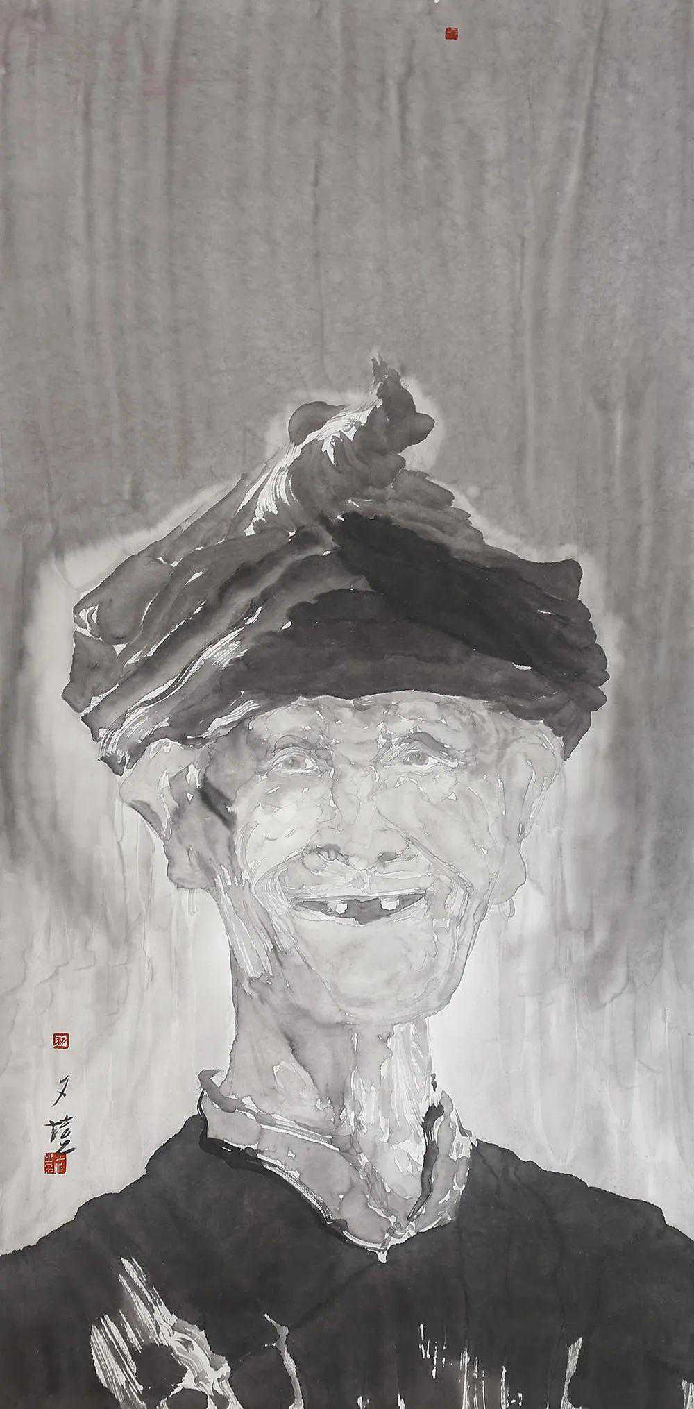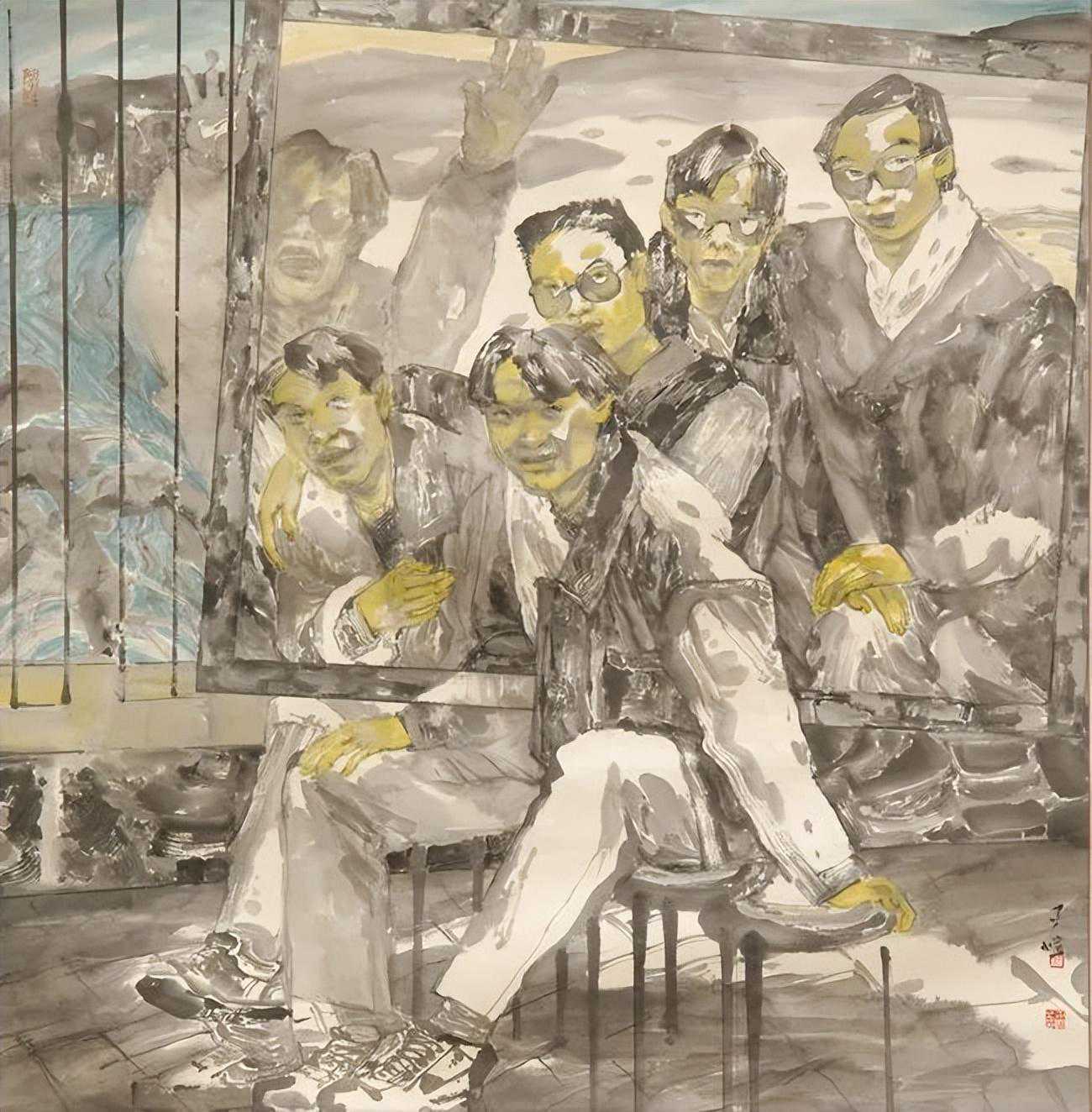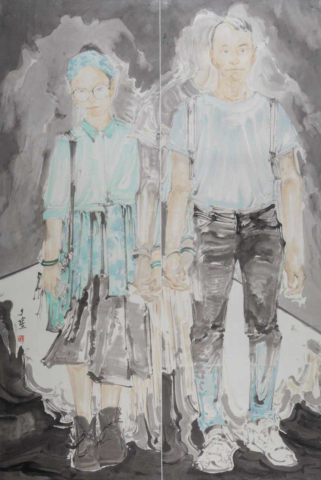 孙夕恺的《水墨肖像》系列,是定位于对某个群体生活状态思考后的一种情感陈述。画面中人物的动态和布局具有象征意味,在表现形式上尽量发挥宣纸笔笔留痕的效果,使之弱化空间和质感,强调水墨韵味。