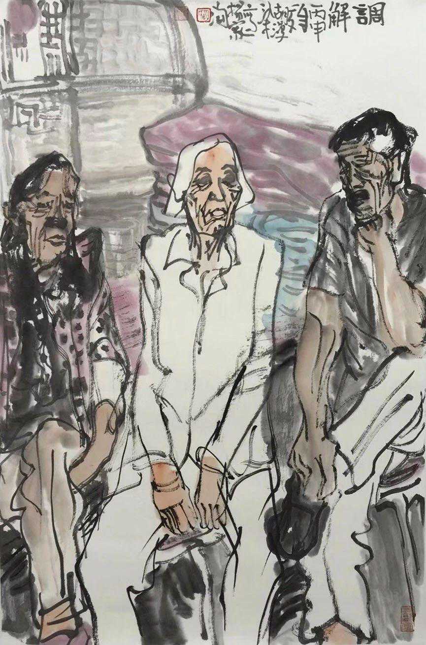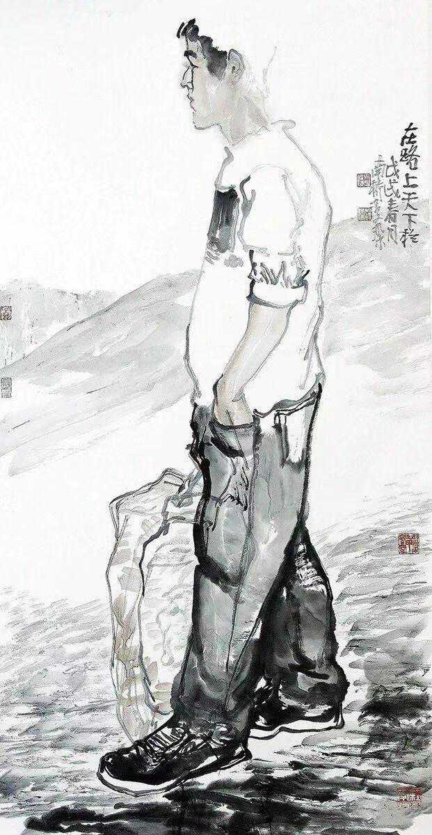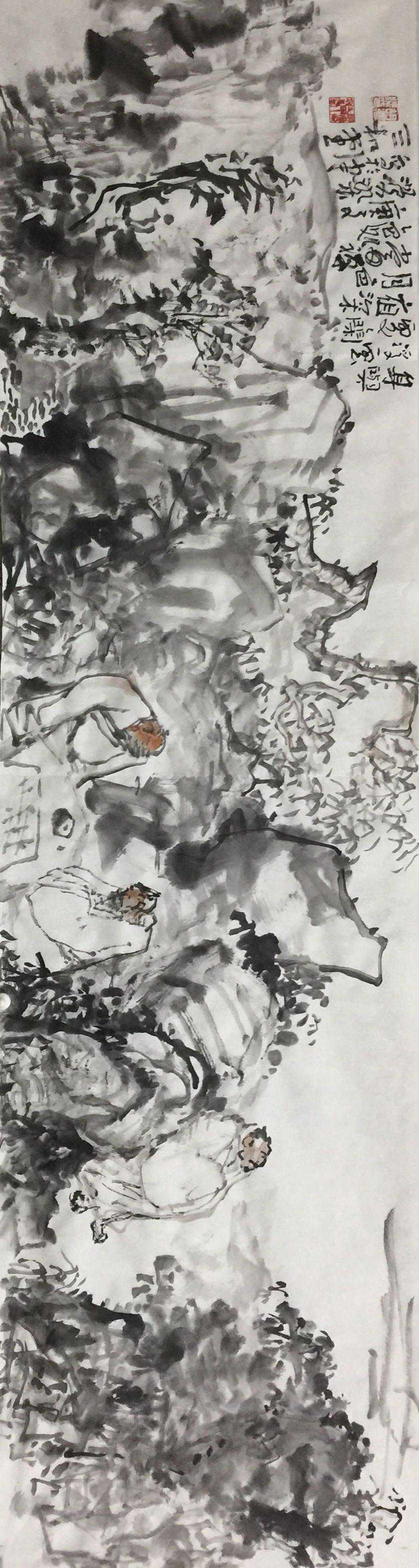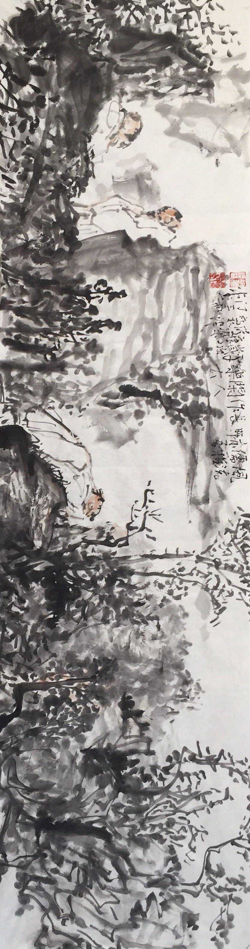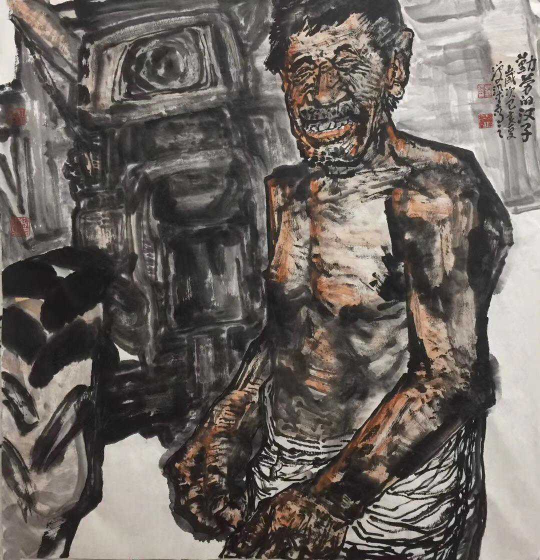 人物造型朴拙,线条方圆有致,看似随手漫笔,实则意趣横生。苍茫水墨间,似有铿锵之音,又有悲壮之气。所谓画为心声,盖胡君家乡,龙蛇大泽,英雄逐鹿之地,英烈千秋,雄风犹存。