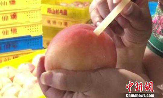 “多按几下之后你会发现,桃子会变得很软,捏上去有点橡皮泥的感觉。这个时候,只要开一个口子,里面的汁水就会渗出来了。”王凌云一手拿着吸管,一边告诉记者,按桃子时不能用力太大,不然会把桃皮挤破。