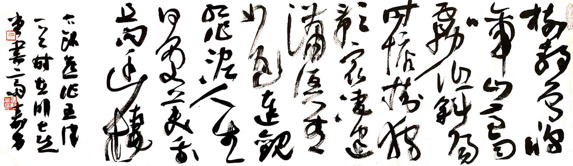 江寿男书法很抒情,尤其他所擅长的行草书,让人一看就知道他是一位很有艺术天赋的聪明人。书家一般可分为功力型和表现型,功力型书家比较注重技术法则与形式规范,对线条与字结构有较强的恒控力;表现型书家不拘泥于成法,注重内在性情的抒发,其领悟能力和想象能力要强于功力型书家,江寿男两者兼备,而显然偏于后者。他敏而善思,勤奋好学,涉猎广泛,尤其对书法的创作始终保持着旺盛的精神。江寿男对线条和字结构的塑造有着自己独特的语言,飞动而不失沉稳。他五体皆能,并已形成自己如一风貌。以他对书法性情与形质的理解,使他的创作始终保持在潜意识下进行。如陶宏景《与梁武帝论书启》中所言“手随心会,笔与手会”,抒情的意味非常浓郁,能将内心的东西表现出来,这点很重要。(吴东民)