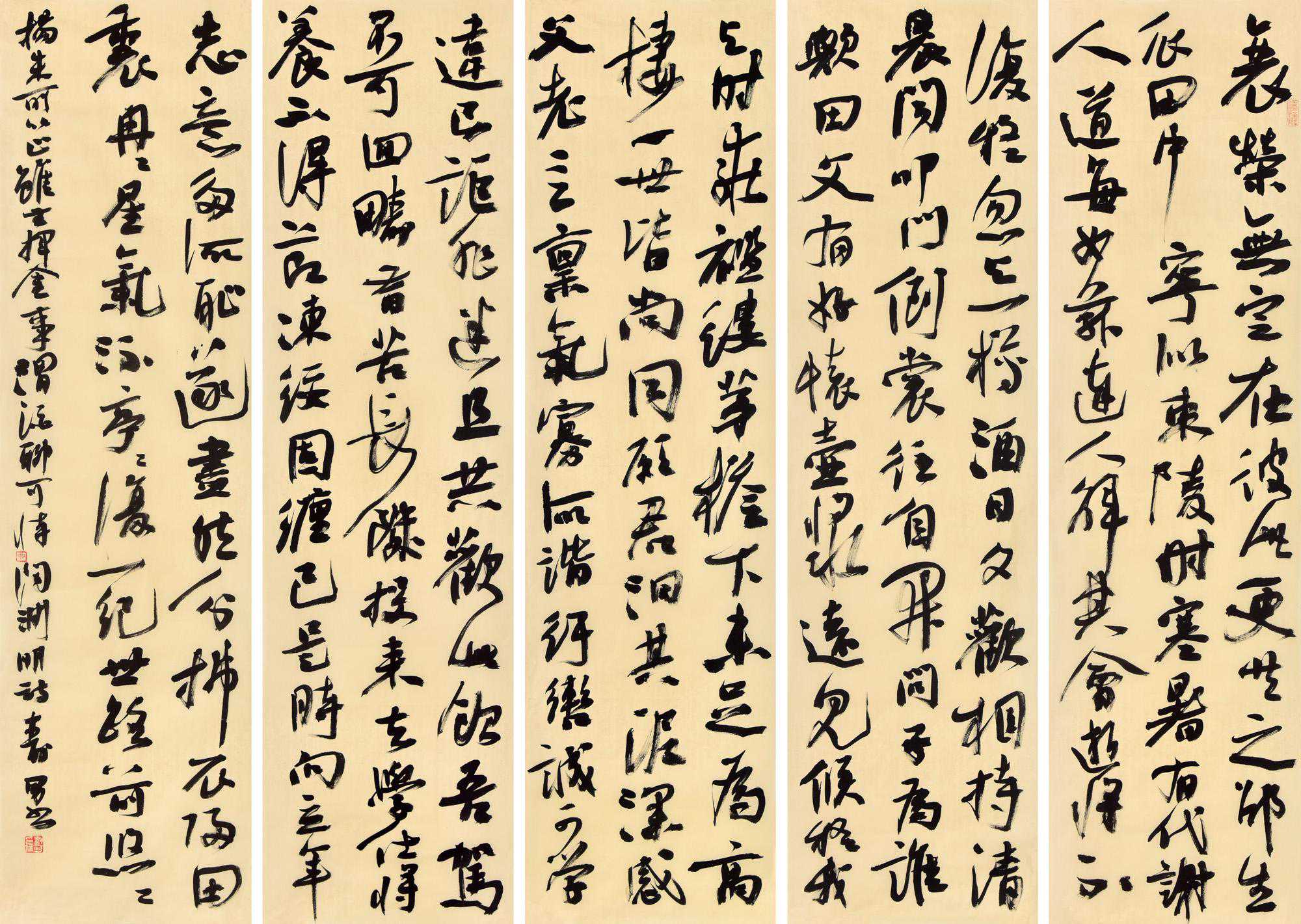 三,格局宏阔,小中见大。看傅抱石先生的山水册页,不足一平尺的小画,往往有千里之势。我看江先生的小字书法也有这种感觉:小作品,大气象。江先生写小字喜欢使大笔,站立书写,他不斤斤于小技巧、小变化,而是从整体着眼,以大观小,再加上多年对线质的锤炼,使他的小字作品迥出时流,略无纤巧轻薄之态而具昂扬郁勃之气。(秦纪明)