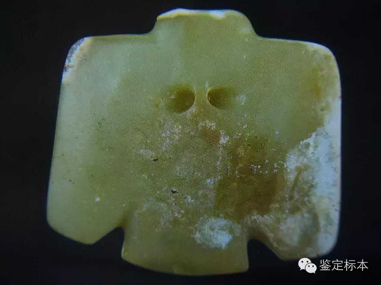 表面拋光痕嚴重的痕跡模糊,其它痕跡相對完整。綹裂的邊緣腐蝕形成塌陷,綹裂處邊緣自然的塌陷,是鑒定玉器真偽的重要依據。內部的白化體現了玉器腐蝕不均勻的規律。