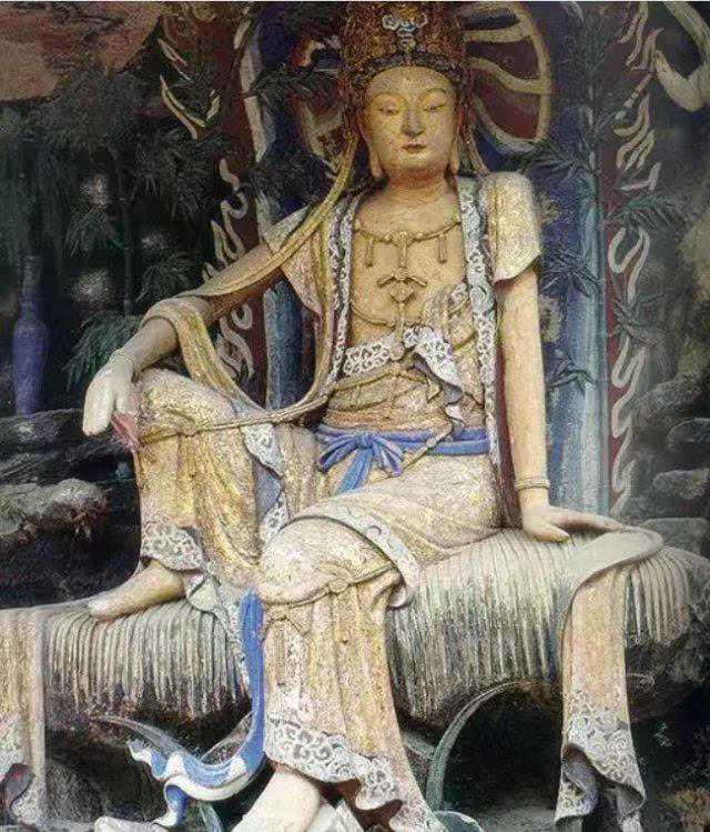 5、河北正定隆兴寺五彩观音菩萨像,俗称“倒坐观音”。观音像衣袂飘飘,彩妆绚丽,面容秀丽恬静,是古代彩塑中不可多得的艺术珍品。