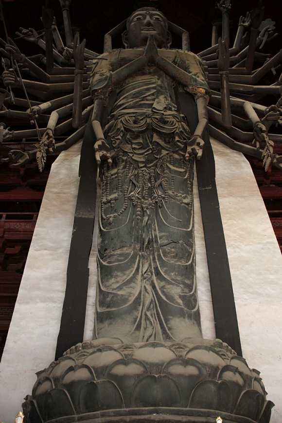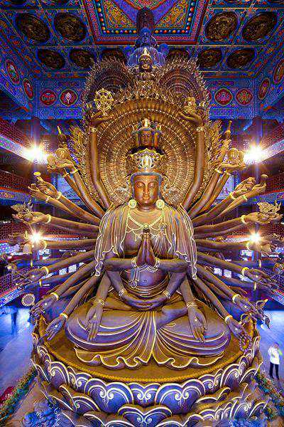 10、河北正定隆兴寺大悲阁观音菩萨铜像,高21.3米,拥有42只手。其中,两手在胸前合十,左、右两侧各有20只手侧举。在侧举的40只手中,分别拿着日、月、净瓶、金刚杵、乾坤带等法器,象征着观音菩萨拥有极大的法力,可以为广大众生解除各种各样的苦难。