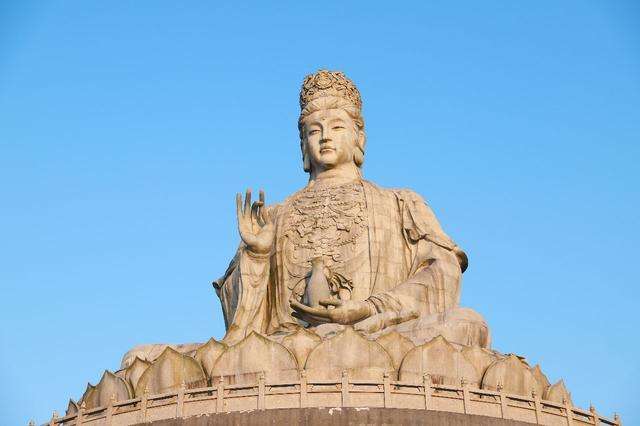 2、浙江普陀山南海观音圣像,立像台座三层,总高33米,其中佛像18米。观音像顶现弥陀,左手托法轮,右手施无畏印,妙状、慈祥,体现了观世音菩萨“慧眼视众生,弘誓深如海之法身”。