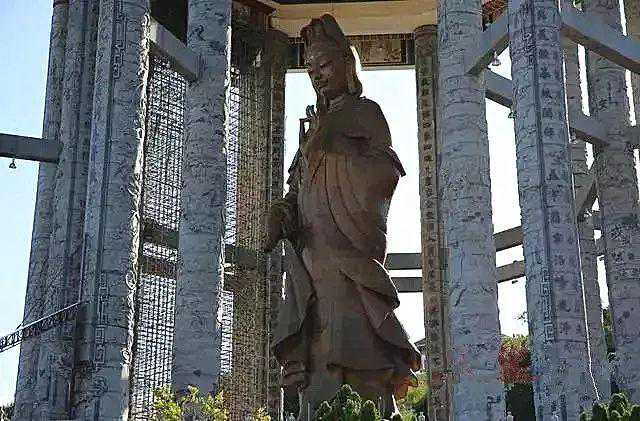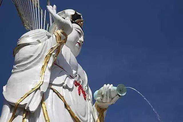 18、台湾灵鹫山多罗观音,高12米青铜铸造的黑面金身观音矗立山顶,据说,多罗观音是一位救世大菩萨,她坐在白色的莲花座上,依其本誓,是观世音菩萨因慈悲天下众生,伤心时掉下眼泪的变化身。