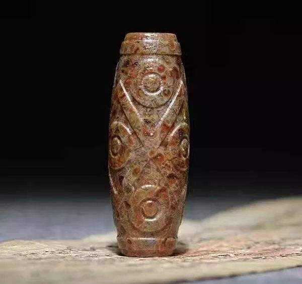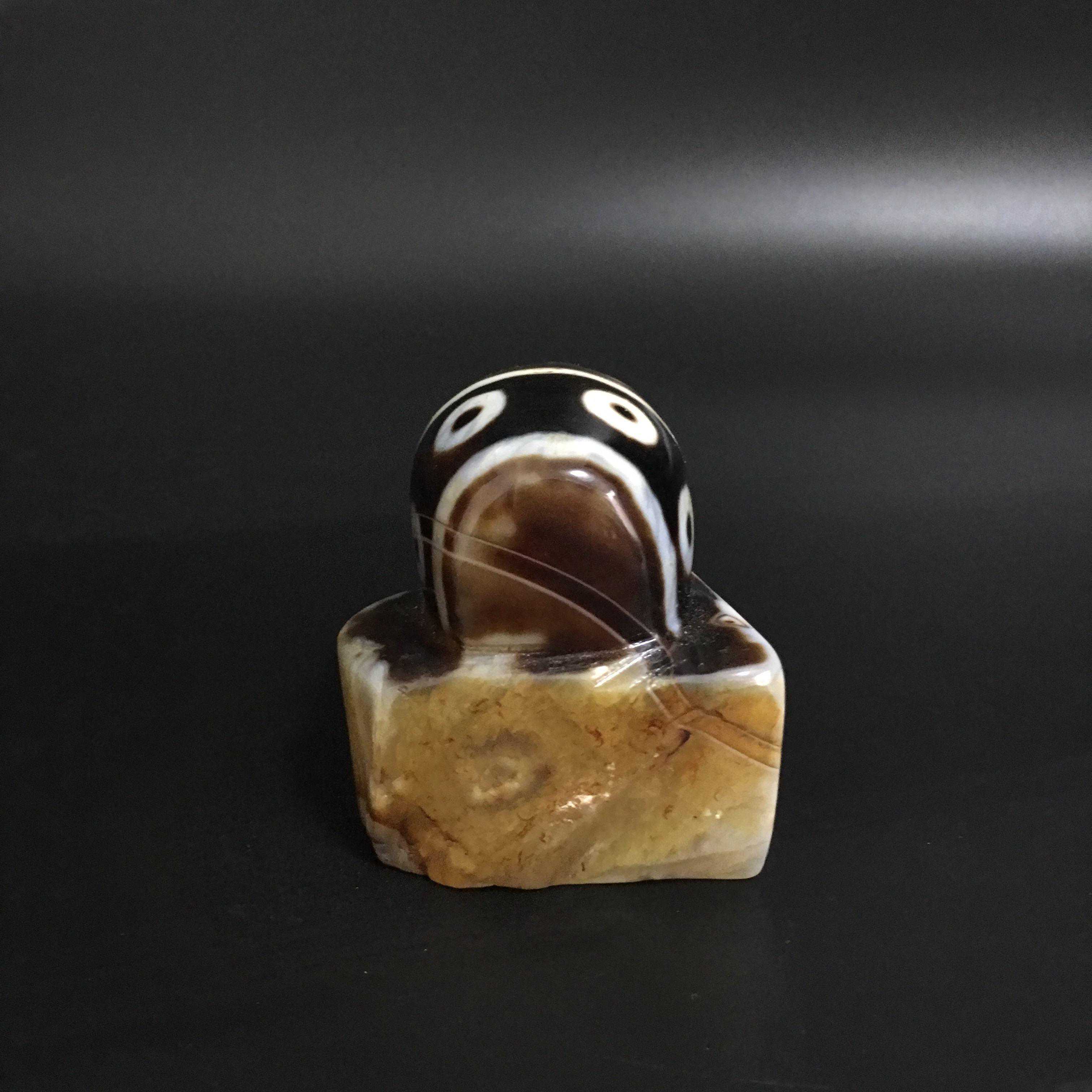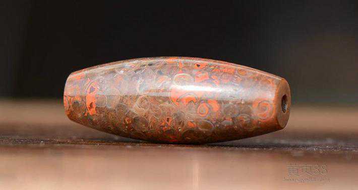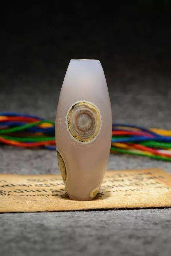 另一种是由含玉质及玛瑙成分的九眼石页岩打磨而成的天珠,叫“九眼石页岩天珠”,也叫“天眼天珠”。