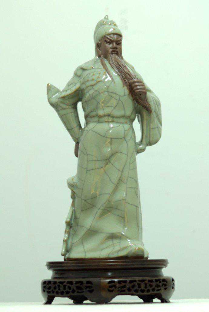 关公因“三国演义”一书流传至广而深入中国民心。其造像之特色,是紫红脸膛,丹凤眼,美髯飘拂,或坐或立。坐姿,有时捧春秋而读;立姿,则手执青龙偃月刀。读春秋,意谓定下春秋大义;执大刀,则意谓刀斩不义之人。此尊关公,在粉青色调上有浓淡之分,脸部手足则露出胎色呈紫铁,加上动态、神情的揣摩,使此作更具风彩。官窑瓷器经过数百年的失传,在现代科技、艺术与工艺的结合之下,不论造型设计、胎釉配方都足与古人媲美!