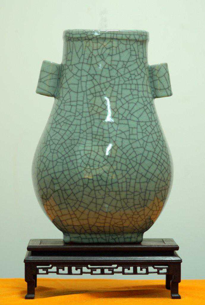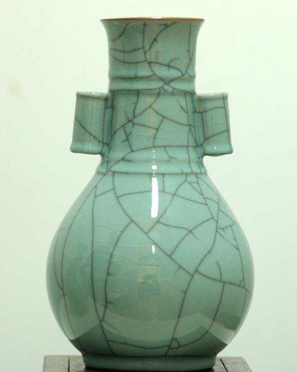 此瓶敞口,方形口,颈部对称双贯耳,圈足,通体施青釉,开冰裂纹。胎体坚致,釉层肥厚,器型古朴,恢弘大气。