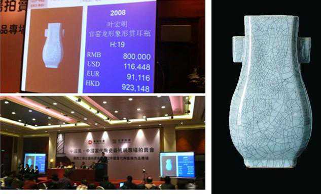 2012年12月9日上午在杭州黄龙饭店举行的“中国风•中国当代陶瓷艺术展专场拍卖会”上,叶宏明先生作品“官窑龙形象形贯耳瓶”在拍卖会上掀起高潮。经数十轮竞价,以八十万元成交。叶宏明的这件官窑作品工艺独特。官窑象形开片是根据胎釉膨胀系数不同的原理,通过二次热处理工艺完成,在国际上首创变不规则开片为规则开片,在产品的釉面上能开出似龙、如凤等形态的象形开片,是传统陶瓷工艺结合现代科技的创新产品。相关作品在1984年由国家轻工业部访英代表团赠送英国国会,得到了极高评价。