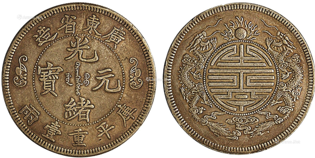 当然除了这枚双龙币以外还有一种双龙形式的币,只不过它不是流通的货币而是一面军功牌,这枚钱币就是"八品功牌”双龙币,前面中间是“八品功牌”字样。左右两边是双龙戏珠的图案。反面是“两广总督岑”字样。