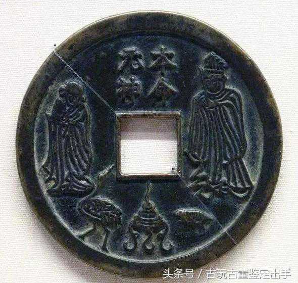四.传世古,古钱有的是历代流传下来,并没有埋入土的,所以多数圆钱没有红绿锈,仅在钱的表面有一种黑褐色,这种颜色称为传世古。也有的虽然埋入土中过,但出土后经日久摩擦,红绿锈大半脱落,仅在少数处尚残留一些绿色或红色,(张三少注:也有留有蓝色。锈留下的多少与盘玩的时间与坑式,如果玩的时间短,锈也会留下的比较多)其余部分都已变成黑褐色的铜质,这种称为半传世古。伪造这种颜色的方法,通常有下述两种;