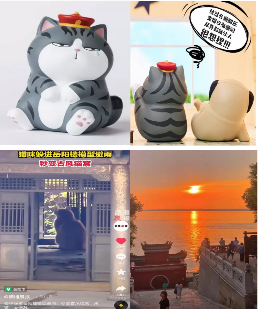 通过将岳阳楼内的楼猫,以定制还原成气模的方式展现在游客面前,让游客感受到岳阳楼的一丝温暖和可爱。放在岳阳门的平台处,伴着夕阳,让游客与楼猫一起欣赏洞庭湖的日落,感受这一刻的美好,让时光停留在这一秒钟……