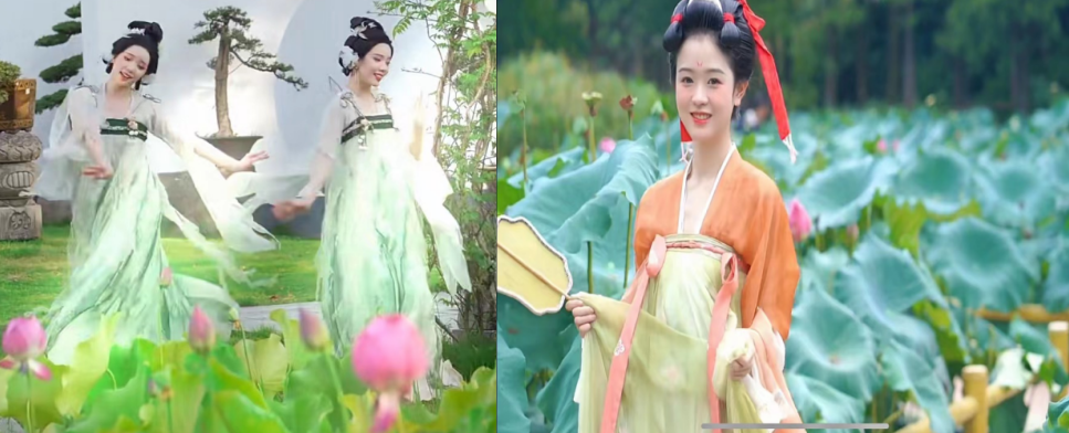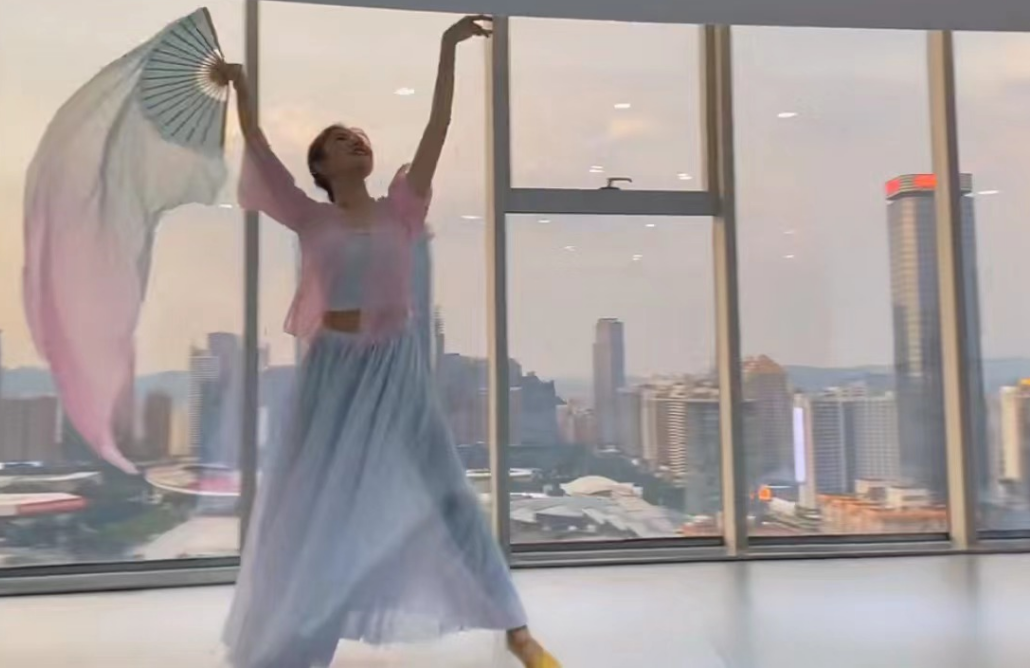 内容呈现:手持绸扇,温婉动人,倒影好似在轻拂舞者手中的扇。