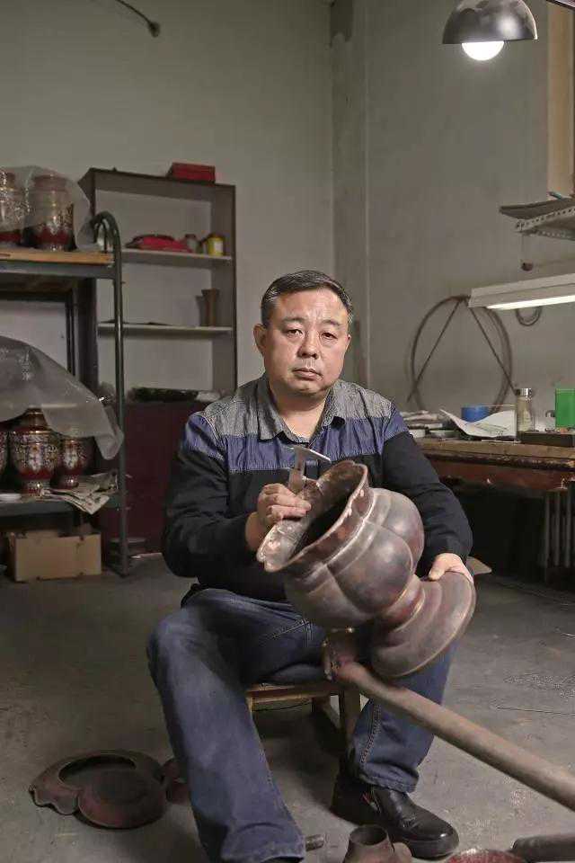 ↑2016年11月10日,“张氏景泰蓝”艺徒,“张同禄珐琅艺术中心”负责人张旭在铜胎制作室。