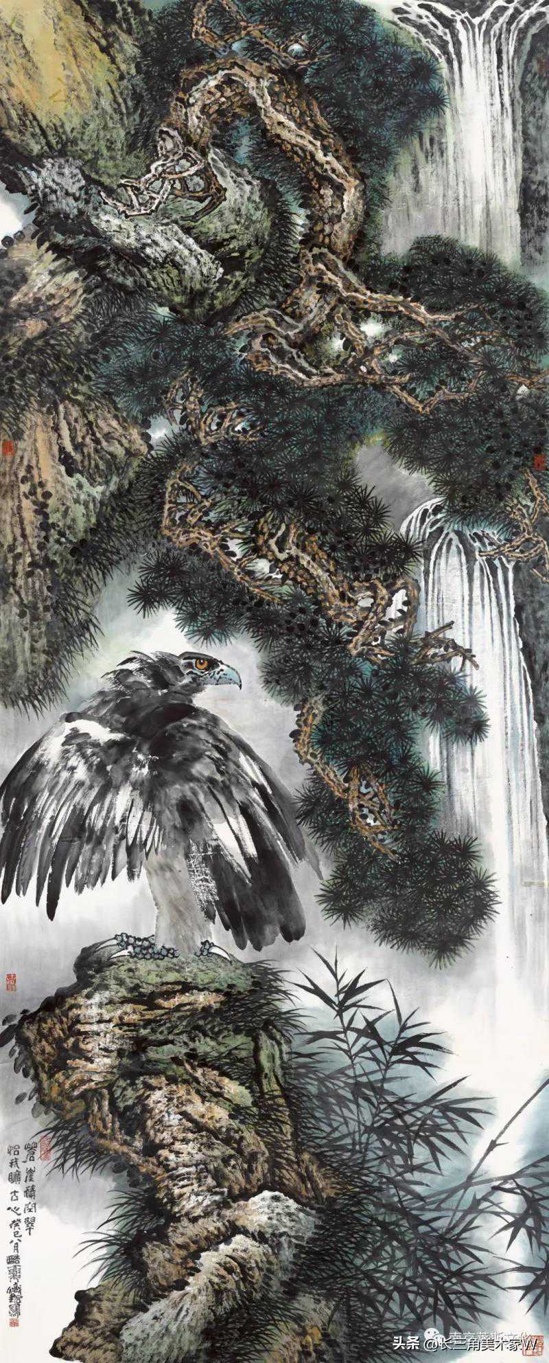 邱炽铭的彩墨写意花鸟画,多以大幅、巨幅见长!其画呈现厚重沉稳,融入了传统与现代、民族与民间等多种元素,综合而成为一种现代彩墨写意形态。造型的意象性,形神的意趣性,用笔的书写性,色彩的表现性,贯穿着“写意重在抒情”的精神。他那传统水墨写意与现代色彩观念相结合的形式,让人感受到类似汉像石刻、敦煌壁画、民间木雕的那种“民族性”——大气、韵味、壮丽与豪情。