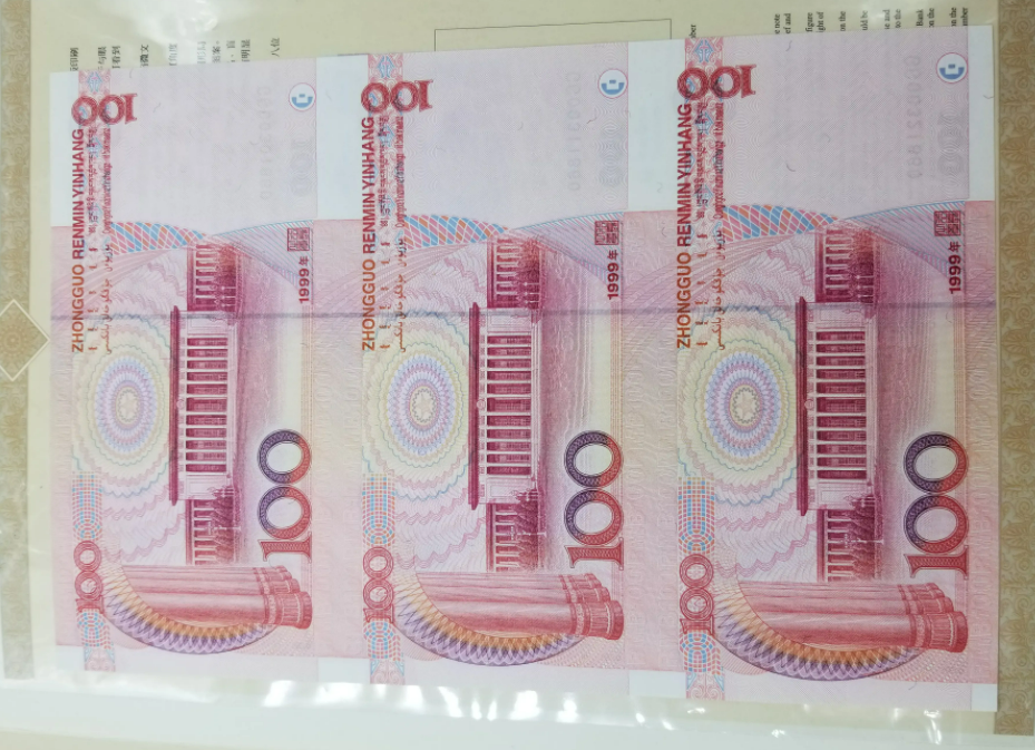 另一种,是3张连在一起装帧的,叫《2000年世纪龙卡》,它也是五版币中唯一的连体钞。里面装帧着3张未经裁切的99版100元纸币。
