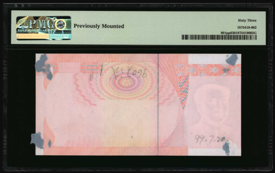 目前,99版的100元,相对是比较少见的。它是最早发行的五版币,在流通5年以后,逐渐被05版的纸币所取代。