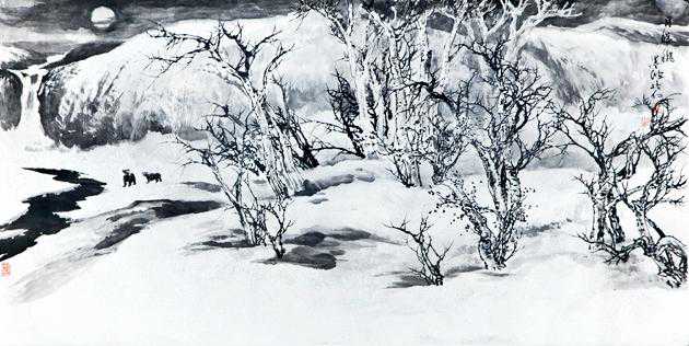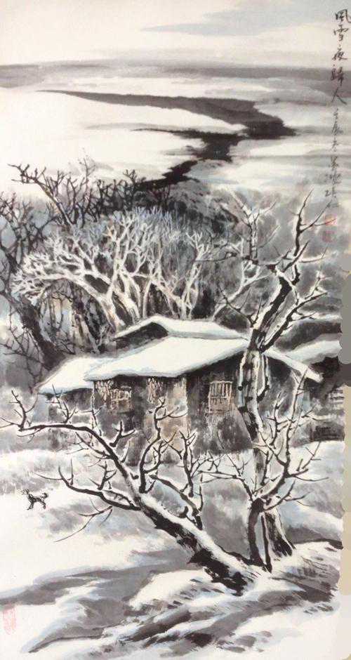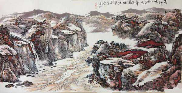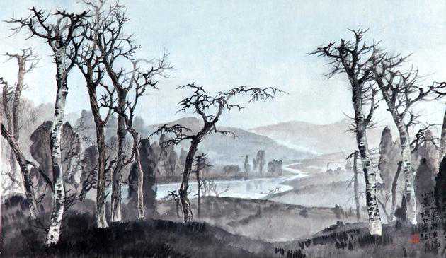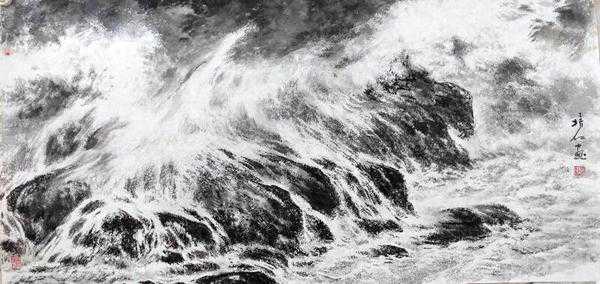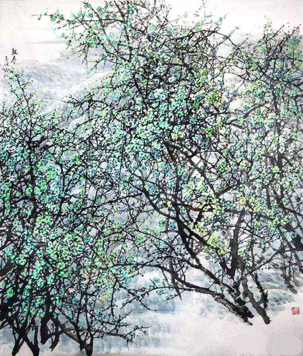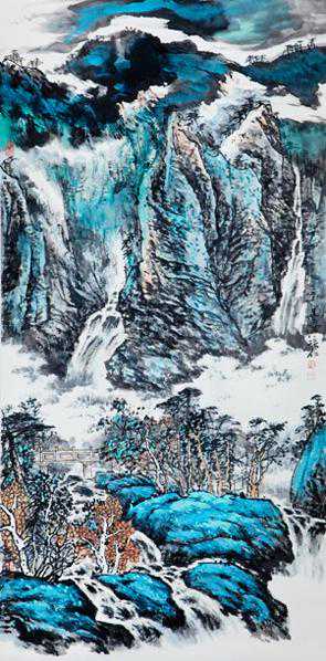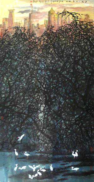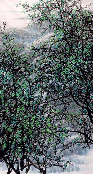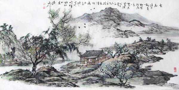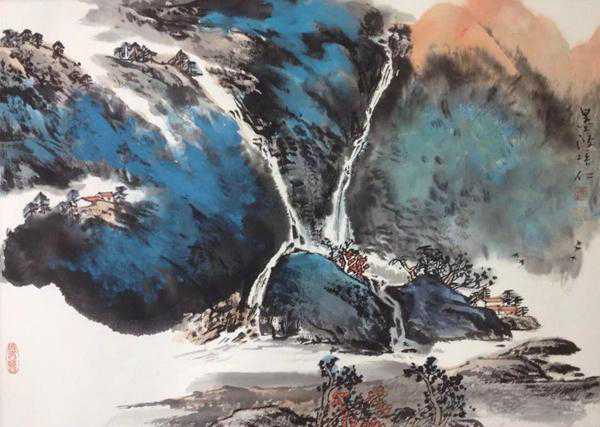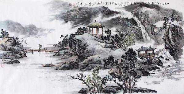 戴陪人的山水画,吸取古今多种画法,有青绿,也有水墨,有密体也有疏体,有皴擦点染并用作品,也有纯以点线高度概括提炼的作品,有泼墨泼彩的山水,也有精细刻画但发挥笔墨表现韵律感的山水。其山水作品既以传统的提炼手段扩大画面内涵,又与今天的实际生活环境结合起来,因此具有浓郁的生活气息。我仔细阅读了他的山水画近作,把传统的技法用现代抽象构成去解构,画面既不失笔墨,然而效果却耳目一新,此探索是传统与现代,今人与古人的完美结合,是培仁先生在山水画上的大胆突破。