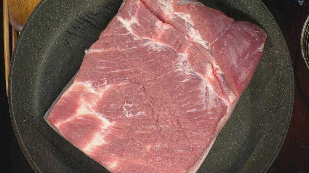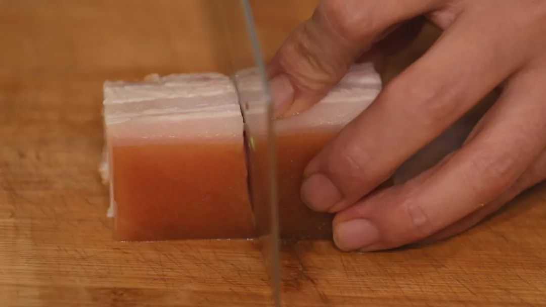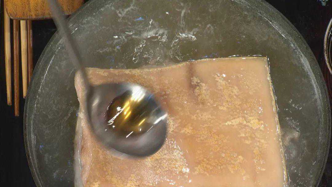步骤1:五花肉放入锅中,肉皮朝下,烙制金黄,盛出,用水清洗干净;锅中烧水,水开放入五花肉,加入少许料酒,煮至5分钟,捞出;