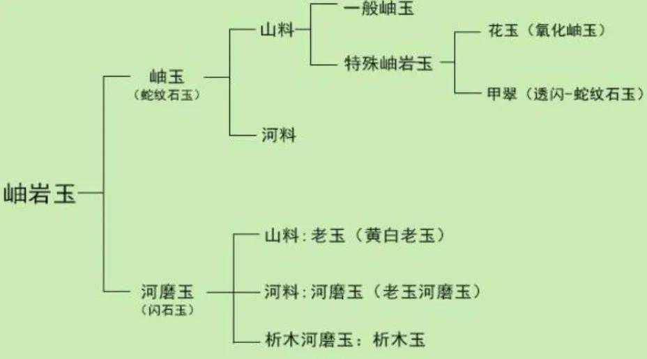 可分为透闪石、蛇纹石、透闪石和蛇纹石混合体三种,其中以透闪石玉料与蛇纹石玉料为主。