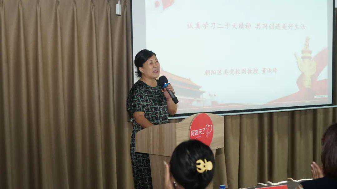 会议开始,“朝之花”巾帼宣讲团作先进事迹报告。宣讲团成员王静首先作了宣讲发言,她讲述了自己作为“第一代北漂人”,通过不断提升学历从而实现自我价值的过程,深深地鼓舞了在场的阿姨;北京威斯汀酒店李艳梅以“萤火微光原为其芒”作为演讲主题,表达了万千女性只要汇聚在一起就可以形成一股强大的力量,肯定了女性在社会中的作用;新媒体工作者梁静讲述了她心中最美的园长,一个为民服务、兢兢业业的园长形象就此跃然纸上;朝阳区区委党校老师董淑玲以“认真学习二十大精神,共同创造美好生活”为宣讲主题,向阿姨们普及了二十大为家政带来的变化,以及未来家政人应作出的努力。
