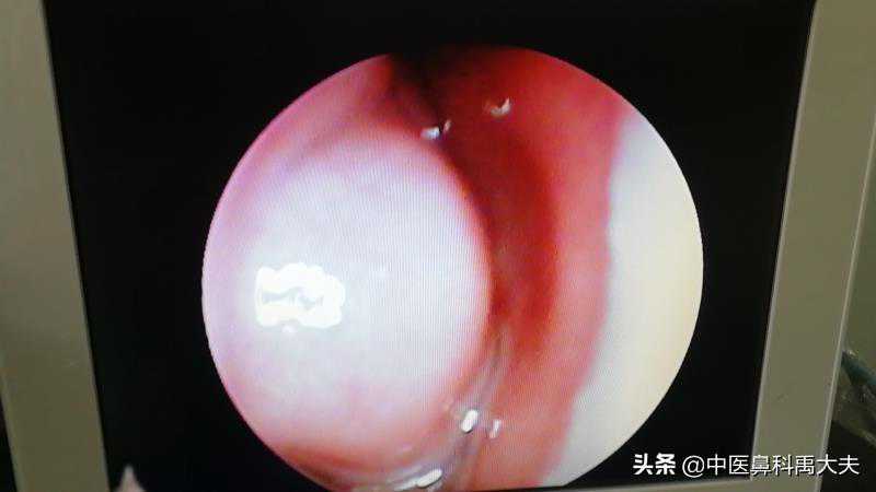 下鼻甲肥大,下鼻道、总鼻道空间没有,鼻中隔轻度偏曲,下鼻道有分泌物。