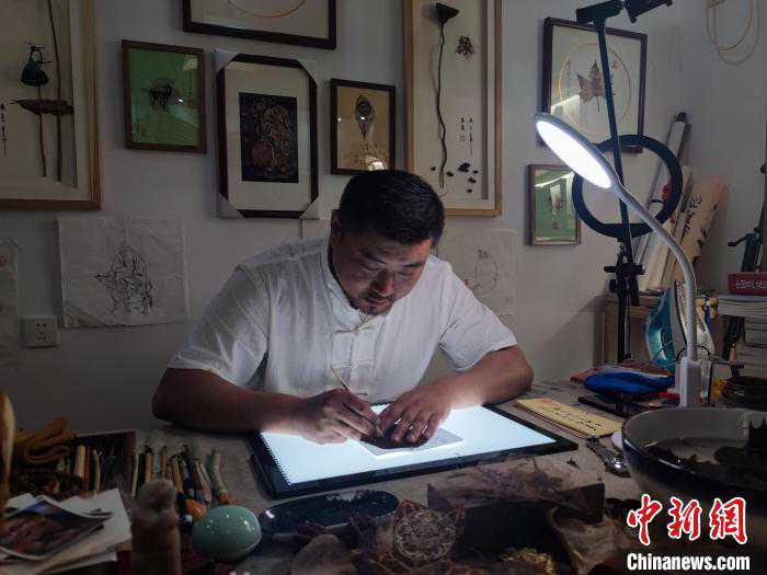 选叶、蒸煮、过水、捶压……经过复杂的工序后,再运用绘画、雕刻等工艺,最终创作出薄如蝉翼的叶雕作品。