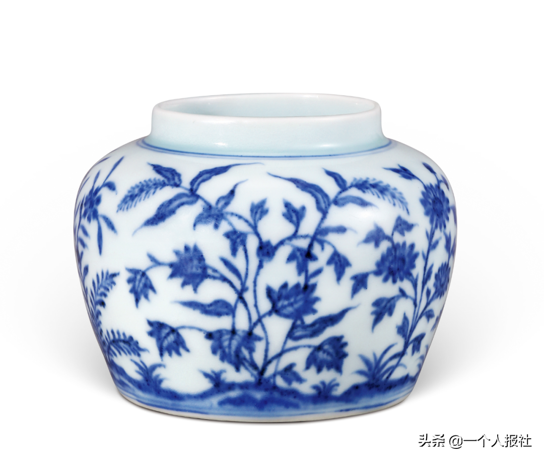 本品直口,短颈,丰肩,扁圆腹,圈足。器以青花绘菊花、石竹等盛开的花卉,间绘蝴蝶翩跹翻飞,摇曵飘香,为成化时期御窑瓷器。《博物要览》评价有:「成窑上品,五彩供养浅盏,草虫浅盏。青花纸薄酒盏,五彩齐箸小碟香盒……各制小罐,皆精美可人」。本品造型饱满,胎质细腻,釉质温润肥腴,画意生动,绘制纤柔精细,疏朗明快,为成化青花器中的精品,展现出陶工高超的技艺和艺术修养。