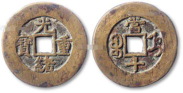 “光绪重宝”是清德宗爱新觉罗.载湉在光绪年间公元1875年-1908年所铸的当五、当十钱。形制较小平钱工整,面文为清秀楷书,直读,背穿左右为满文宝局名,上、下为汉文“当五”或“当十”二字。传世以户部宝泉局和工部宝源局铸造的较为常见,旧谱所列的各省局铸造的18品,恐系补铸,今不多见,而部颁样钱,则价格都较高!