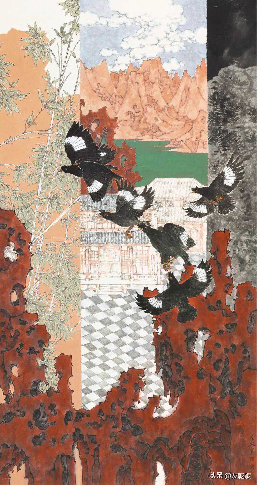 杨亦舒《莺鸟》中国画189×78cm
