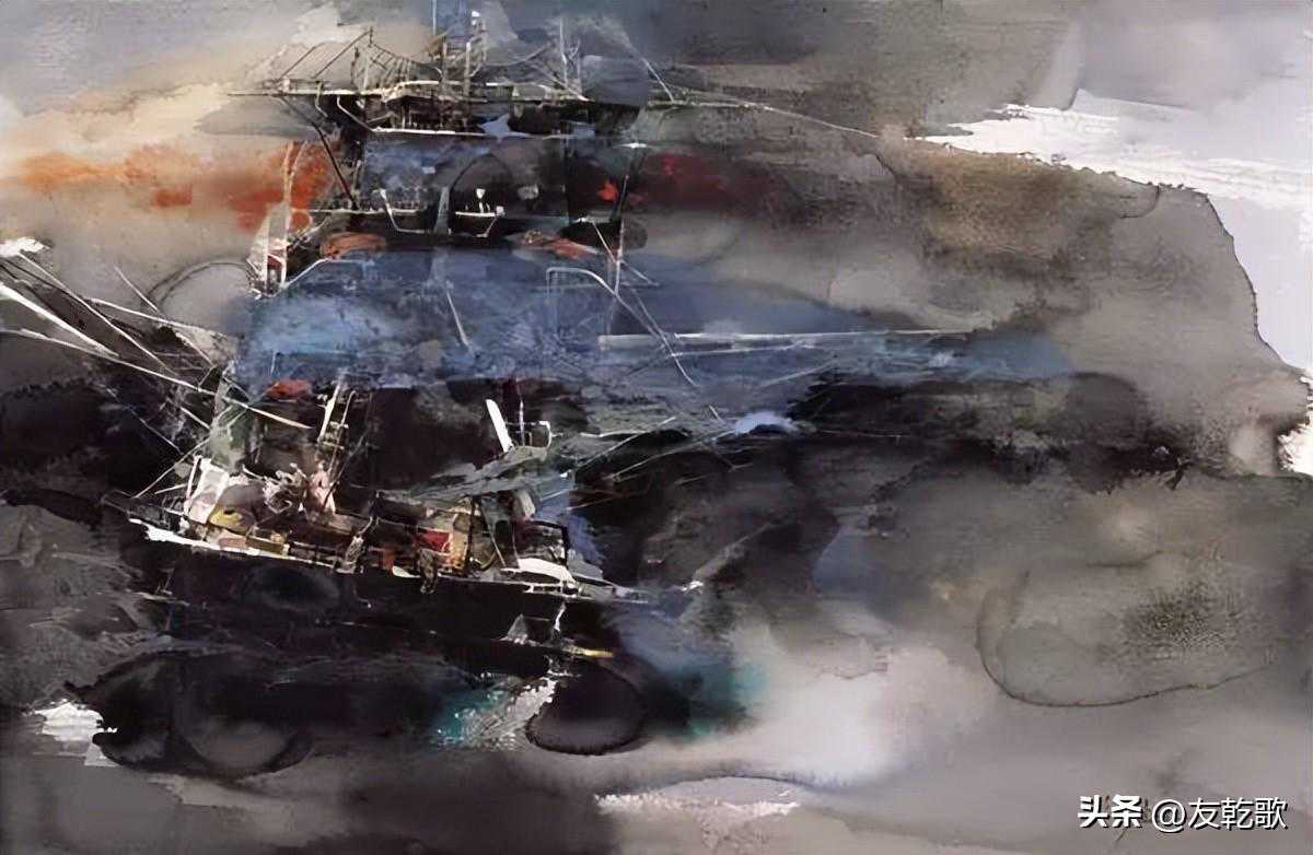 胡贻孙《北海船坞》水彩38x54cm