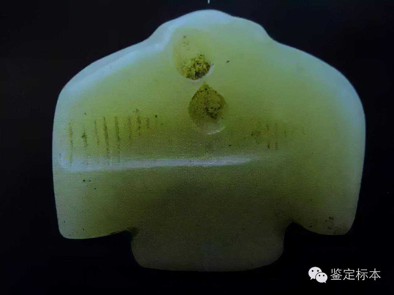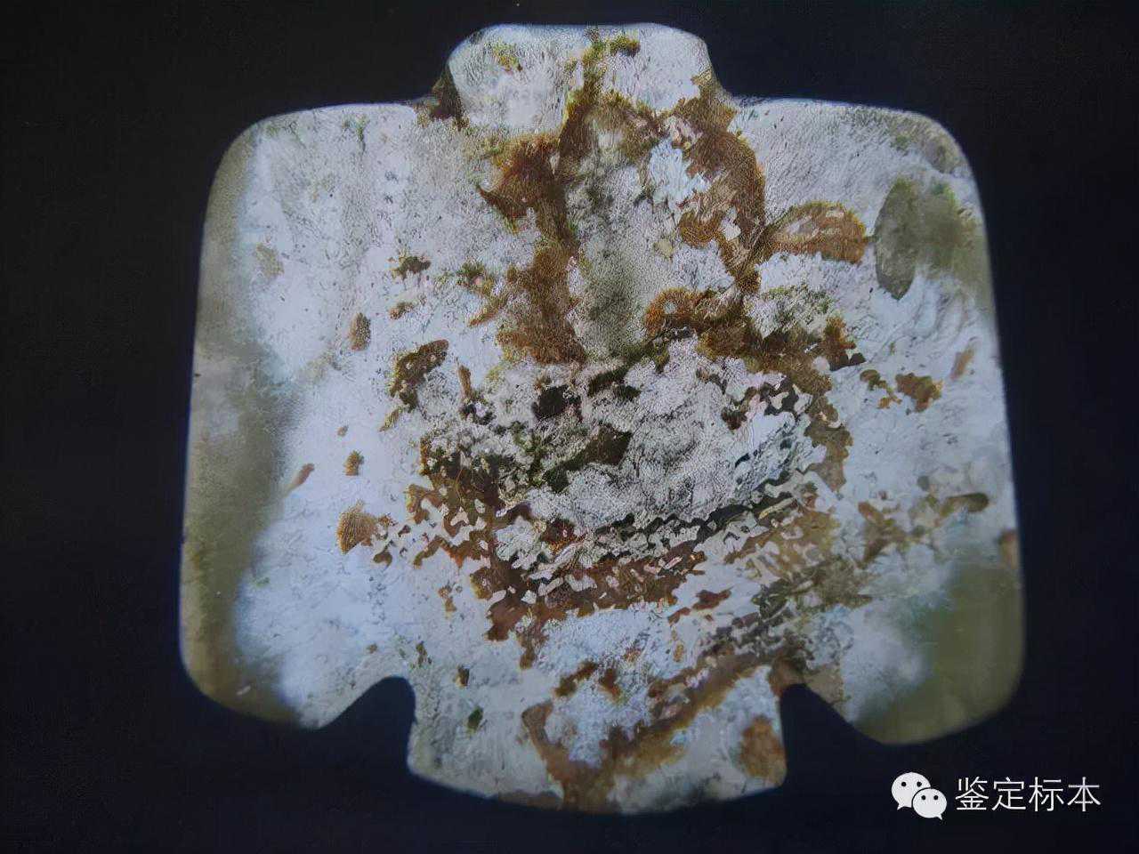 表面拋光痕嚴重的痕跡模糊,其它痕跡相對完整。綹裂的邊緣腐蝕形成塌陷,綹裂處邊緣自然的塌陷,是鑒定玉器真偽的重要依據。內部的白化體現了玉器腐蝕不均勻的規律。